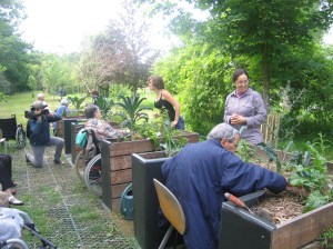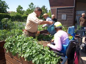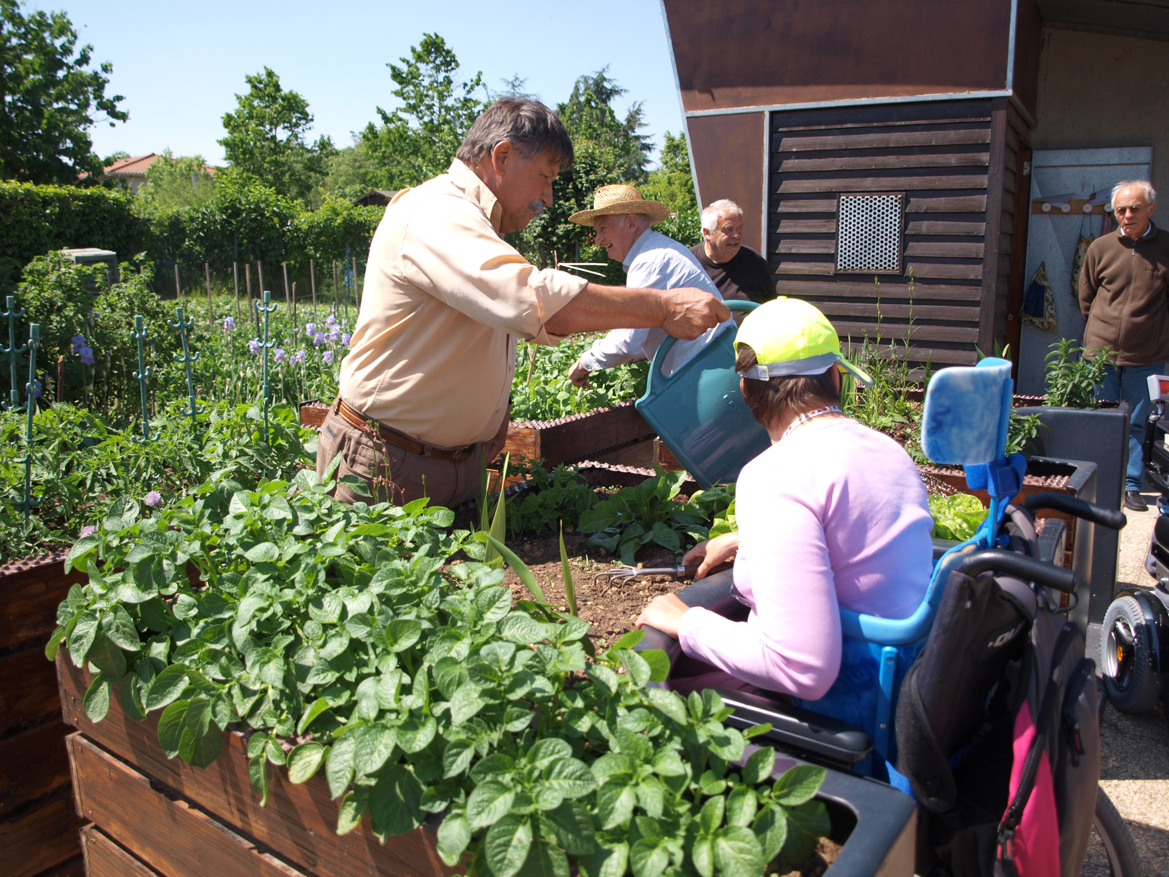 Entraide au jardin entre valides et non valides. Les membres de La Valise réfléchissent à des solutions d’arrosage pour les jardiniers à mobilité réduite (photo @ un membre de l’association des jardins familiaux du fort de Bron, près de Lyon).