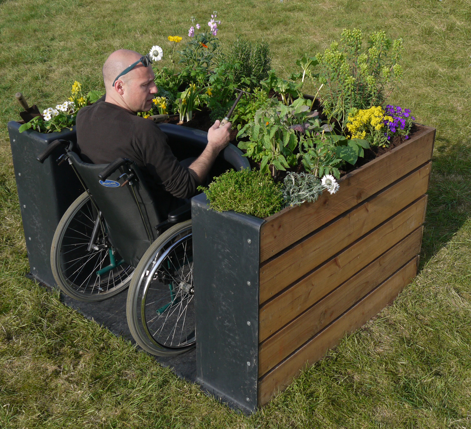 Samia, Boris et Pascal qui ne sont ni jardiniers, ni ergothérapeutes retournent la demande de Chantal dans leur tête, ils travaillent sur des croquis. Ils discutent avec des centres de rééducation motrice, des jardiniers en fauteuil roulant. Grâce à des subventions venues du milieu culturel, ils présentent en 2004 leur premier prototype en résine (oui, ils sont conscients que la résine est toxique et pas idéale). Ils le décrivent comme leur TERRAform, comme un « jardin adapté pour personnes à mobilité réduite ». Il s’agit d’un bac de 1,50 mètre de largeur pour 1,20 mètre de profondeur et 80 cm de hauteur avec une capacité d’environ 0,80 m3 avec une coque où vient se loger le jardinier et son fauteuil.