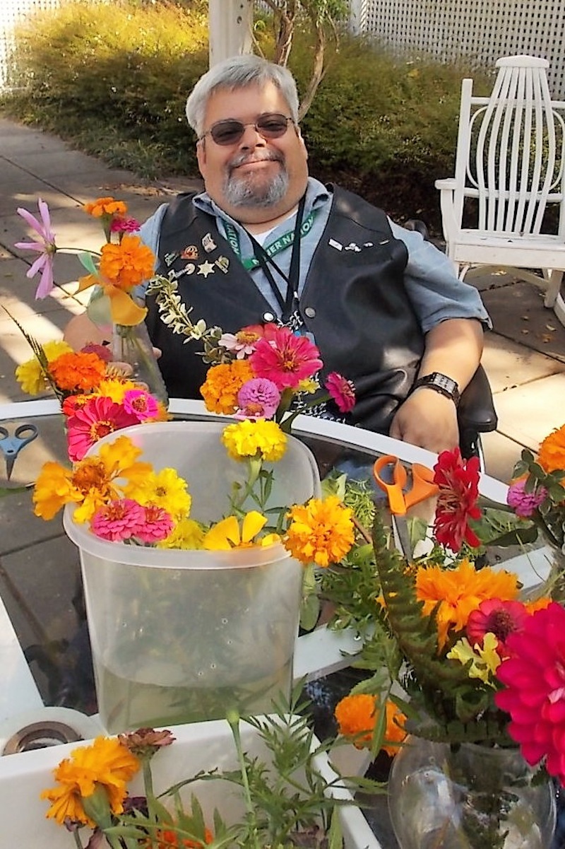 Beth dans le jardin de fleurs au Life Enrichment Center