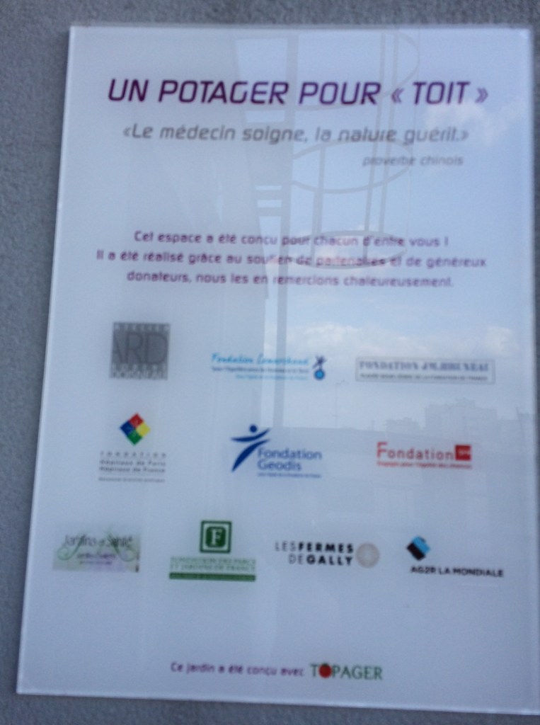IMG_8080 Published mars 25, 2016 at 1216 × 1632 in Financer un jardin : conseils d’une pro de la philantropie Ma très mauvaise photo de la plaque posée à l’entrée du Jardin pour Toit pour remercier les donateurs