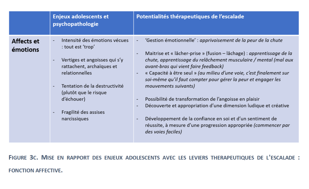 Prévenant que « ce découpage est forcément simplificateur, mais il a le mérite de pouvoir organiser les concepts », Pauline Espi met en relation les enjeux adolescents (corps et motricité, fonctions mentales et cognitives, fonction affective, fonction relationnelle) et les leviers thérapeutiques de l’escalade. Voici par exemple les liens qu’elle établit pour les relations affectives.