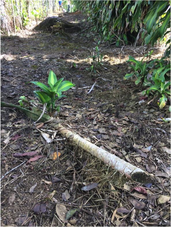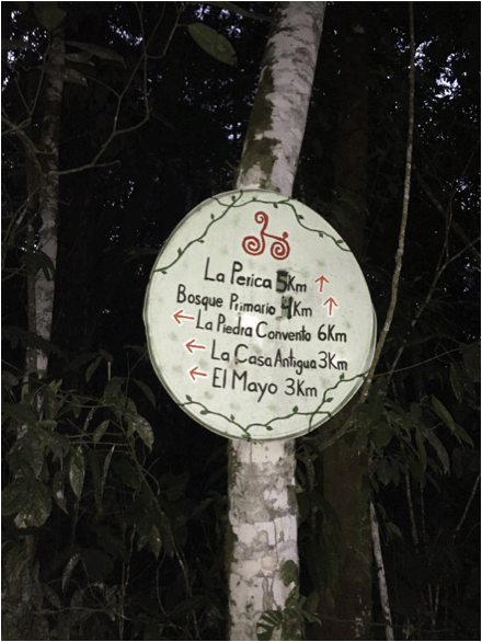 Le lendemain matin j’accompagne Rémy dans son footing matinal. Je découvre le décor dans lequel je vais évoluer et auquel je vais contribuer par mon action ! C’est juste splendide. Nous remontons la « route » principale du village (route de cailloux) jusqu’au premier site de plantations. – Le but est de planter dans des endroits accessibles aux villageois pour qu’ils puissent se servir directement des fruits qui borderont cette circulation. – Puis nous continuons pour arriver à la fin de la route, à la lisière de la forêt. Rémy m’explique qu’il y a plusieurs sentiers qui mènent à différents endroits, dont un qui va rejoindre un site appelé « El bosquet primario » : la forêt primaire.